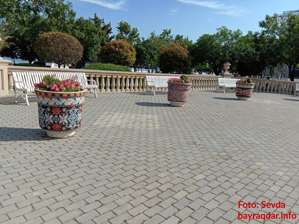Kukla Teatrından dənizə tərəf açılan amfiteatr tərəfdə qoyulan milli ornamentlərlə bəzədilmiş iri gül dibçəkləri diqqətimizi çəkdi.